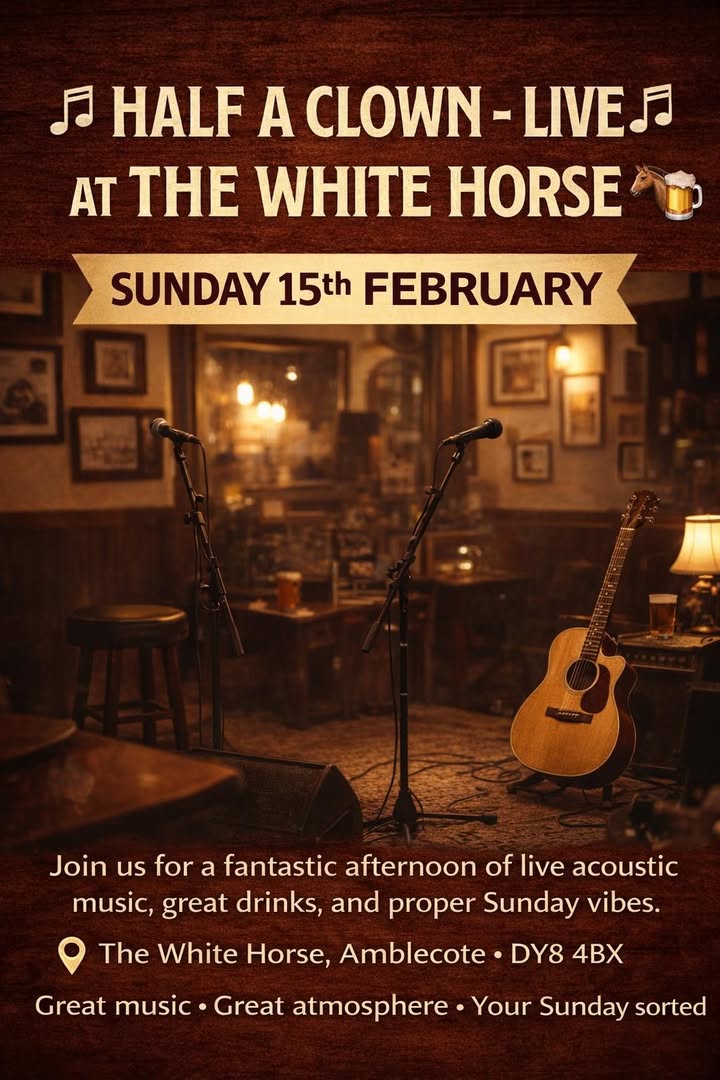 🎶 LIVE MUSIC THIS SUNDAY 🎶 We’re keeping the great weekend vibes going here at The White Horse 🐴🍻 🎤 Half a Clown – Live 🗓 Sunday 15th February ⏰ 4.00pm – 6.00pm Join us for a fantastic afternoon of live acoustic music, great atmosphere and of course your favourite drinks flowing 🍺🎸 Perfect way to round off your Sunday after the football! 📍 The White Horse, Amblecote See you there for great tunes, great company & proper pub vibes 😄 #LiveMusic #SundaySessions #TheWhiteHorse #SupportLiveMusic