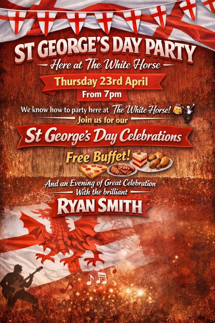 ST GEORGEβS DAY PARTY Here at The White Horse Thursday 23rd April From 7pm We know how to party here at The White Horse π₯³ππ»πΊπ» So join us for our St Georgeβs Day Celebrations Free Buffet ππ°π And an evening of great celebration with the brilliant RYAN SMITH π€πΆ If you want it more bold and poster-style, use this version: π¬π§ ST GEORGEβS DAY PARTY π¬π§ THURSDAY 23RD APRIL FROM 7PM HERE AT THE WHITE HORSE π₯³ππ»πΊπ» WE KNOW HOW TO PARTY! πΊπ»ππ»π₯³ Join us for a fantastic evening of St Georgeβs Day Celebrations ππ°π FREE BUFFET π€πΆ Live with the brilliant RYAN SMITH
