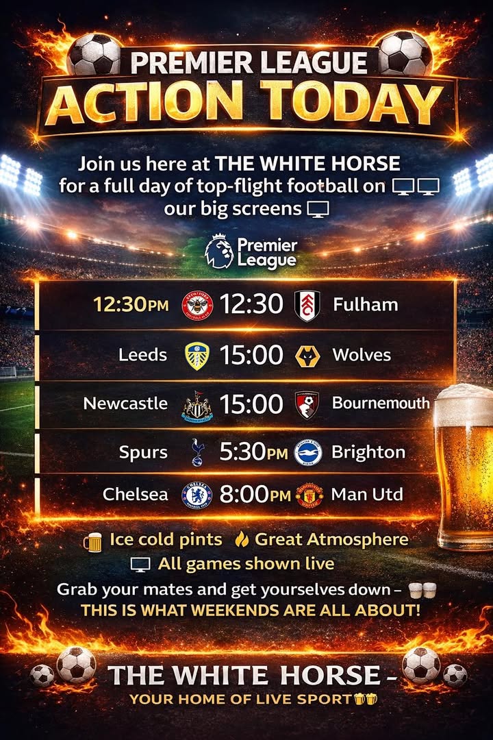 π₯ PREMIER LEAGUE ACTION TODAY π₯β½οΈ Join us here at The White Horse for a full day of top-flight football on our big screens πΊπΊ π§ 12:30PM Brentford π Fulham π 3:00PM Leeds π Wolves Newcastle π Bournemouth π 5:30PM Spurs π Brighton π 8:00PM Chelsea π Man Utd π» Ice cold pints π₯ Great atmosphere πΊ All games shown live Grab your mates and get yourselves down β this is what weekends are all about πβ½οΈ The White Horse β Your home of live sport π»π₯