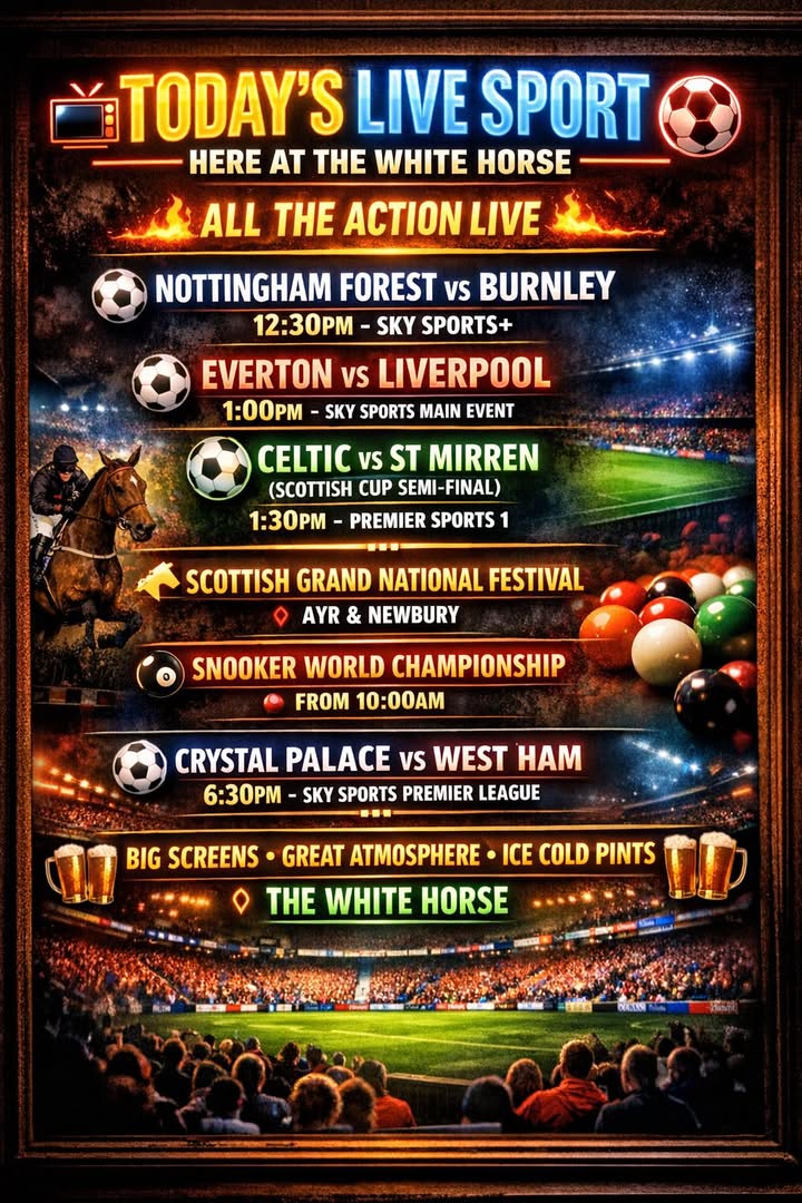 πΊβ½ TODAYβS LIVE SPORT β½πΊ Here at The White Horse π₯ ALL DAY SPORTING ACTION LIVE π₯ β½ Nottingham Forest vs Burnley π§ 12:30pm β Sky Sports+ β½ Everton vs Liverpool π 1:00pm β Sky Sports Main Event π Celtic vs St Mirren (Scottish Cup Semi-Final) π 1:30pm β Premier Sports 1 π Scottish Grand National Festival π Ayr & Newbury πΊ ITV Racing / Sky Sports Racing π± Snooker World Championship π From 10:00am πΊ BBC Two / TNT Sports β½ Crystal Palace vs West Ham π‘ 6:30pm β Sky Sports Premier League π» BIG SCREENS β’ GREAT ATMOSPHERE β’ ICE COLD BEERS π» π The White Horse