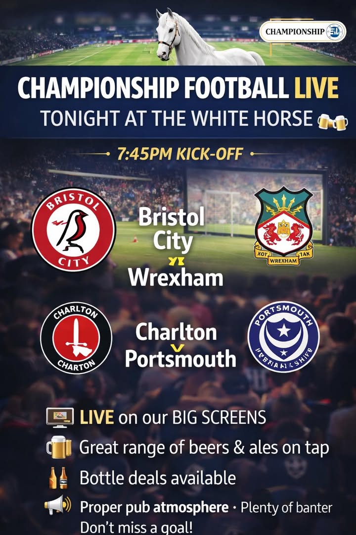 ⚽️🔥 CHAMPIONSHIP ACTION LIVE TONIGHT 🔥⚽️Here at The White Horse 🐴🍻 📺 Showing LIVE on our big screens: 🕢 7:45pm Kick-Off🔴 Bristol City vs Wrexham 🕢 7:45pm Kick-Off⚪️ Charlton vs Portsmouth 🍺 Grab a pint from our great selection🍻 Enjoy our cracking drink deals📣 Proper match-night atmosphere with all the banter! Don’t miss a minute of the action — get down early, get a seat, and cheer your team on with us! ⚽️🔥 #MatchNight #LiveFootball #TheWhiteHorse #ChampionshipFootball