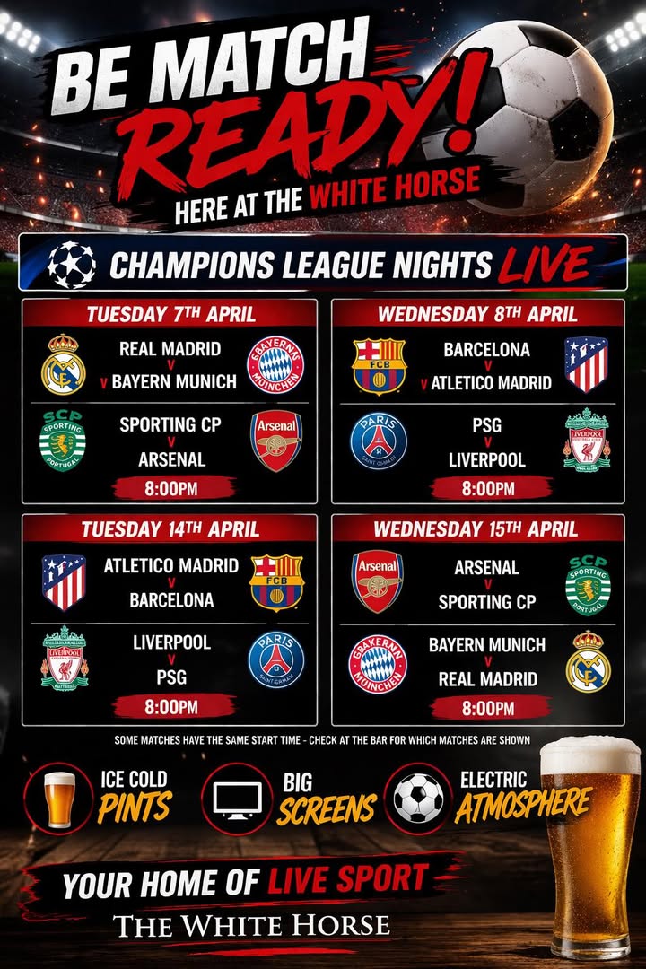 π CHAMPIONS LEAGUE NIGHTS LIVE π΄ TUESDAY 7TH APRIL Real Madrid π Bayern Munich Sporting CP π Arsenal β° 8:00PM π΄ WEDNESDAY 8TH APRIL Barcelona π Atletico Madrid PSG π Liverpool β° 8:00PM π΄ TUESDAY 14TH APRIL Atletico Madrid π Barcelona Liverpool π PSG β° 8:00PM π΄ WEDNESDAY 15TH APRIL Arsenal π Sporting CP Bayern Munich π Real Madrid β° 8:00PM π» ICE COLD PINTS πΊ BIG SCREENS π₯ ELECTRIC ATMOSPHERE β½οΈ YOUR HOME OF LIVE SPORT β½οΈ THE WHITE HORSE