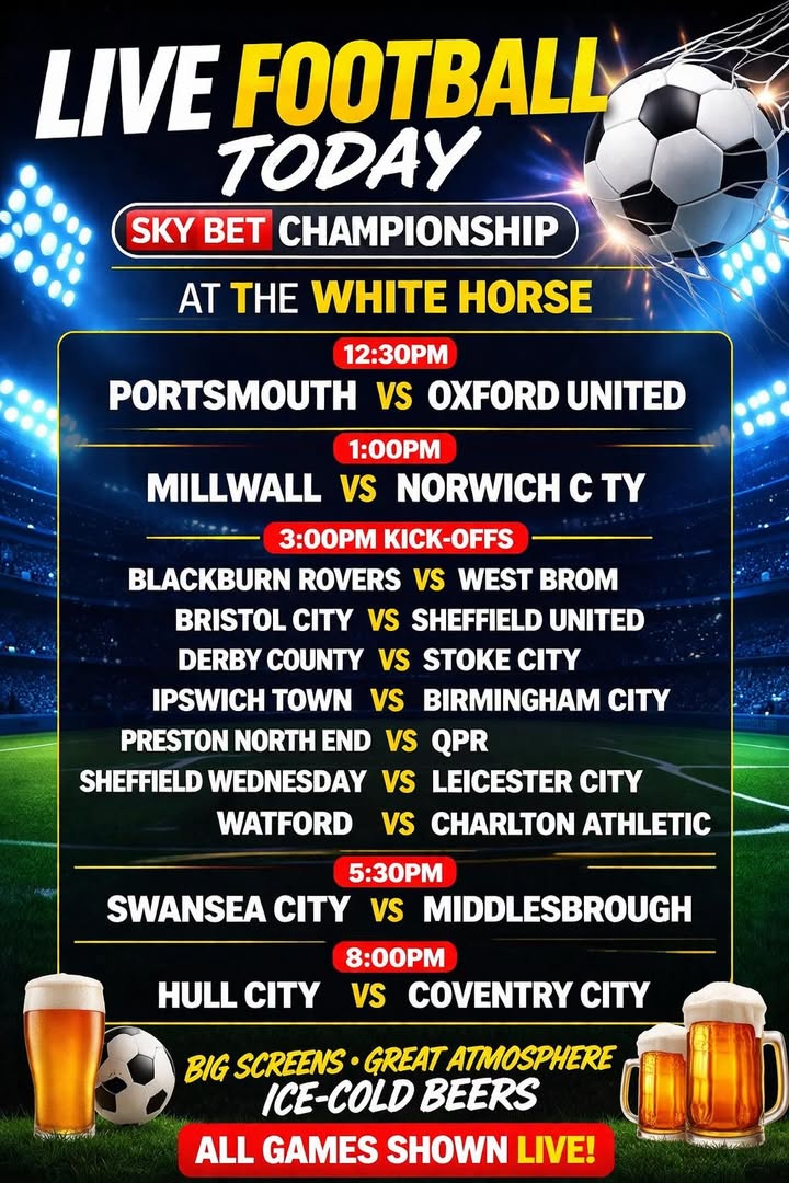 β½ LIVE FOOTBALL TODAY β½ SKY BET CHAMPIONSHIP π THE WHITE HORSE π§ 12:30PM PORTSMOUTH π OXFORD UNITED π 1:00PM MILLWALL π NORWICH CITY π 3:00PM KICK-OFFS BLACKBURN ROVERS π WEST BROM BRISTOL CITY π SHEFFIELD UNITED DERBY COUNTY π STOKE CITY IPSWICH TOWN π BIRMINGHAM CITY PRESTON NORTH END π QPR SHEFFIELD WEDNESDAY π LEICESTER CITY WATFORD π CHARLTON ATHLETIC π 5:30PM SWANSEA CITY π MIDDLESBROUGH π 8:00PM HULL CITY π COVENTRY CITY π» BIG SCREENS β’ GREAT ATMOSPHERE β’ ICE-COLD BEERS π ALL GAMES SHOWN LIVE