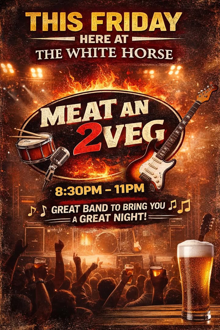 πΈπ₯ THIS FRIDAY AT THE WHITE HORSE π₯πΈ Weβve got the brilliant Meat an 2 Veg bringing the tunes and rocking the night π€πΆ β° 8.30PM β 11PM π₯ Great band πΈ Great music π» Great night guaranteed Get yourselves down early, grab a pint and letβs kick the weekend off properly πΊπ₯ Here at The White Horse β the home of great entertainment